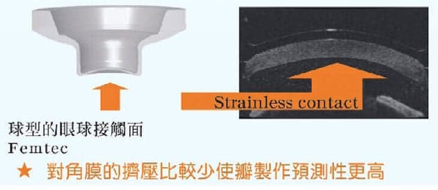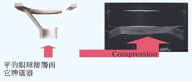 弧形患者接觸面可以維持角膜完整性,避免形成角膜皺褶,降低擠壓壓力,提升患者舒適度,並提高手術精度。它牌儀器 - 平的眼球接觸面